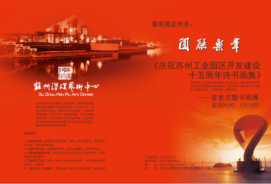值此蘇州工業(yè)園區開(kāi)發(fā)建設十五年之際,由政協(xié)蘇州市委、蘇州工業(yè)園區管委會(huì )聯(lián)合編輯、薈萃詩(shī)文書(shū)畫(huà)名家之作而成的“慶祝工業(yè)園區開(kāi)發(fā)建設十五周年詩(shī)書(shū)畫(huà)集”——《圓融樂(lè )章》首發(fā)式暨書(shū)畫(huà)展將于5月18日,在蘇州工業(yè)園區的李公堤漢璞藝術(shù)中心舉辦。