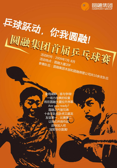 由圓融集團人力資源部和工會(huì )組織的首屆圓融集團“乒球躍動(dòng),你我圓融”乒乓球團體賽即將于2009年7月在集團本部活動(dòng)室拉開(kāi)帷幕。